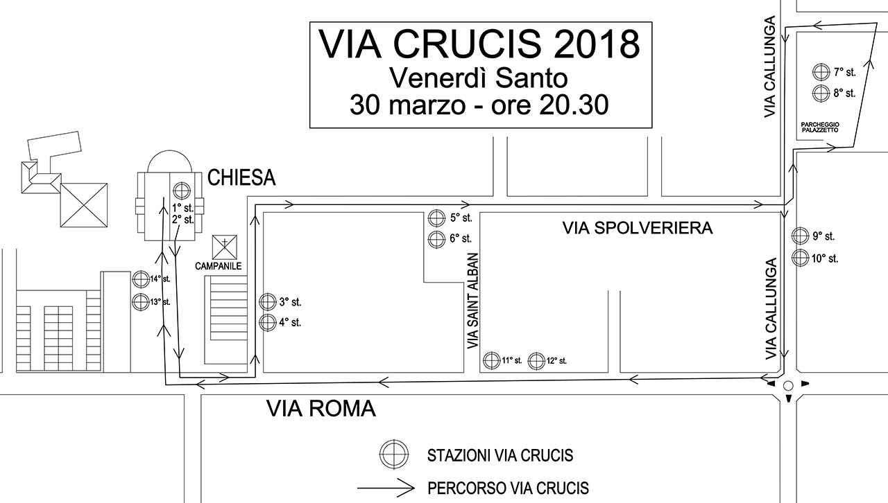 La funzione inizierà alle 20:30 e la Via Crucis si svolgerà come illustrato nel percorso.